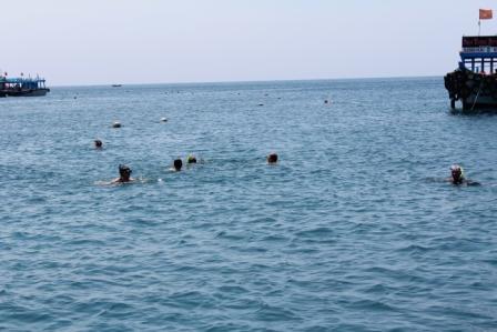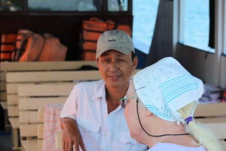 | We meren af bij een eiland waar gesnorkeld en gezwommen wordt | Nu is er tijd voor Marijke om de kapitein van de boot aan de tand te voelen | Na een uurtje varen we weer terug voor de lunch op een ander eiland |