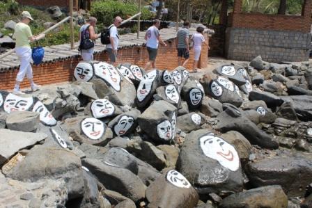 | We leggen aan op een eiland met restaurant | en worden welkom geheten door een stelletje lachende stenen | een overzicht van het hele restaurant-eiland |