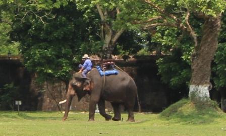 | Bronzen waterbekkens met prachtige afbeeldingen in reliëf | Nog een kleurige poort | Op het terrein liepen ook twee olifanten. Olifanten speelden een belangrijke rol bij de hofrituelen |