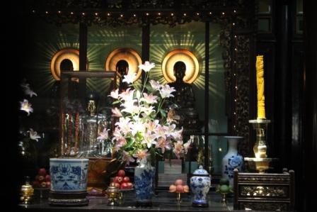 | Ornamenten op het dak van de tempel | Het altaar, tussen de tralies door genomen | De bonsai-tuin |