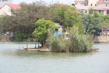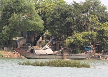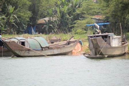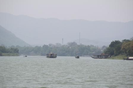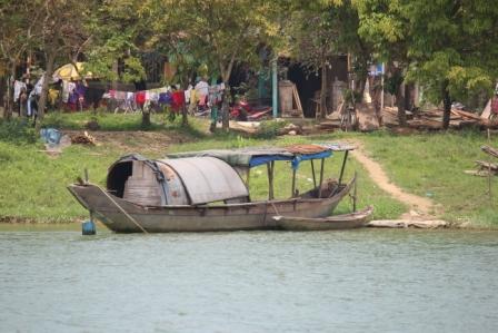 | typische vormen voor deze streek, de hoge voor- en achtersteven | Nog een klassiek bedrijfsvaartuig dat zand lost via een Paternoster | Meditatie-eiland in de Parfumrivier voor Hué |