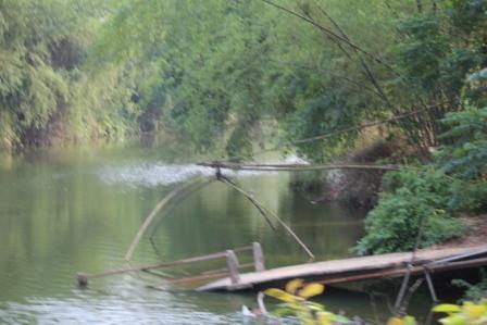 | Een doden-tempeltje onderweg | weer een kruisnet, deze keer onder water | lijkt net of er een groep rolstoelen over de brug komt |