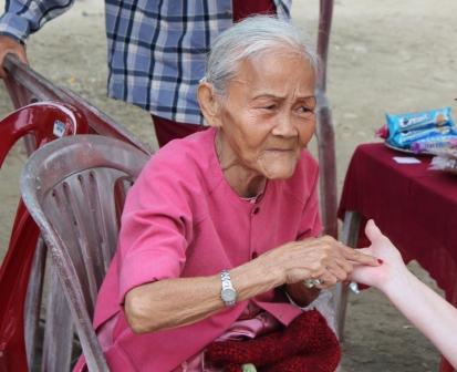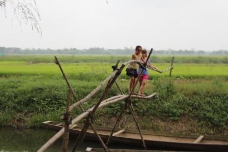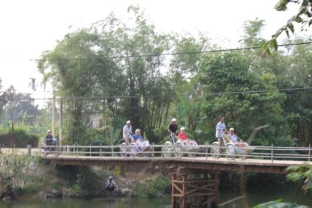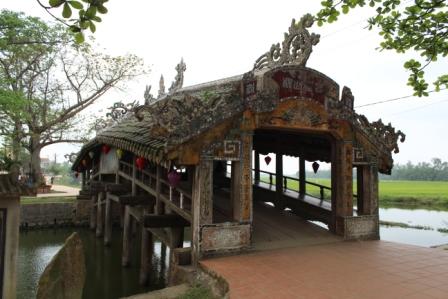 | Het dorpsplein | Marijke wordt de hand gelezen (hele verhaal staat op video) | Weer verder gereden zien we dit bruggetje, zelfs eng voor Vietnamese kinderen |