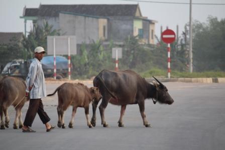 | overstekende buffels en de hoeder | tegenliggend walstuig, het fietspad werd gerenoveerd |
