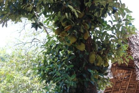 valt op door de enorme vruchten, die aan de stam ontspringen. De
