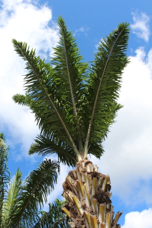 De stam van deze palm is ongewoon glad, doordat oude bladeren