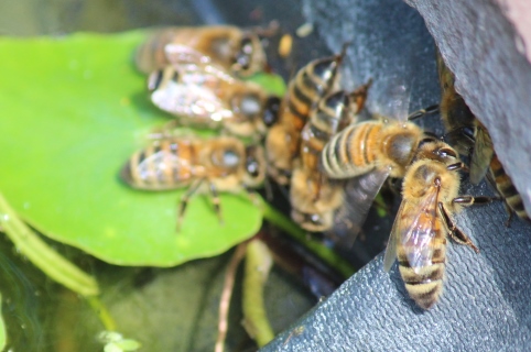 | Nederland Markelo 28 augustus 2022 | Bij grote hitte halen de werksters water uit onze tuinvijver voor verkoeling van het nest - Nederland Markelo 18 juli 2023 | |