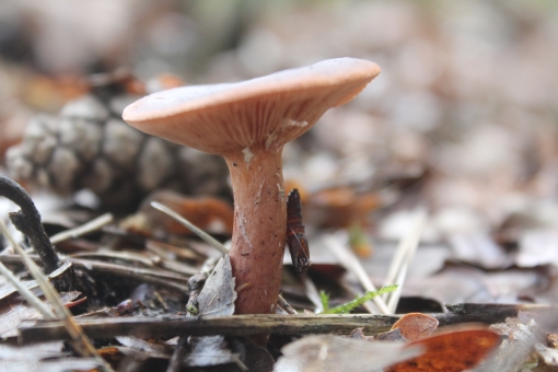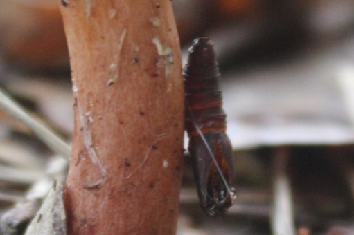 Vlinderpop vastgehecht aan de steel van een paddenstoel