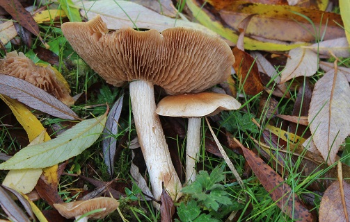 | Wortelende gordijnzwam (Cortinarius rigens) | Vaaggegordelde gordijnzwam (Cortinarius glandicolor) | ||||